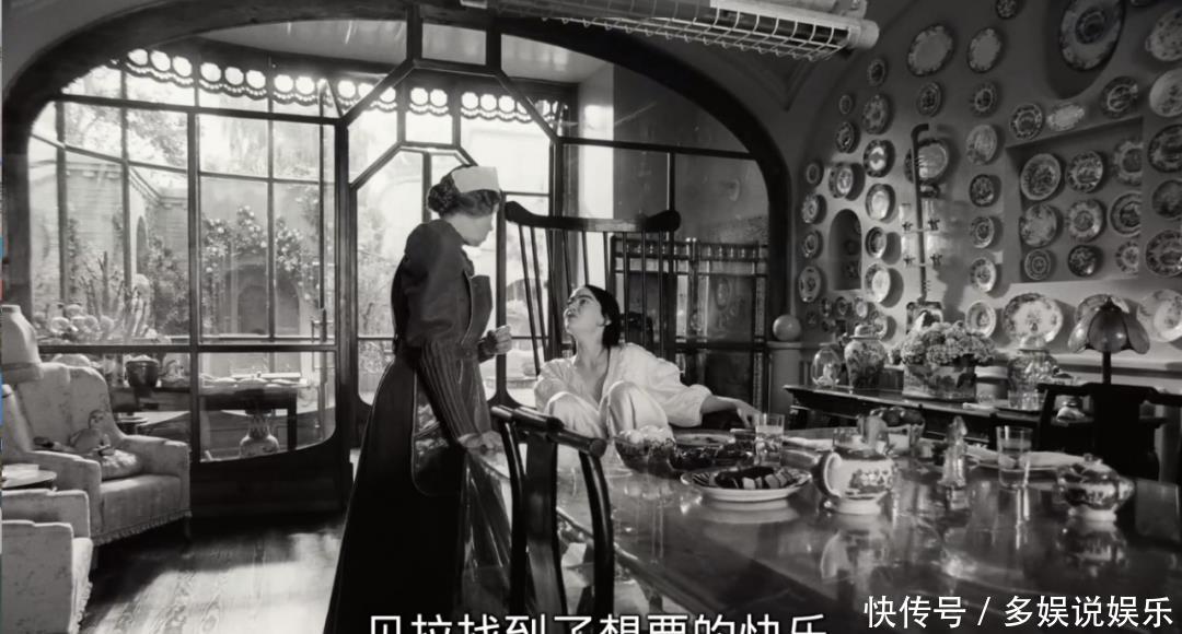 从“初尝禁果”这幕启动,从口舌转为彩色,贝拉诚然化妆像乖癖的洋囝囝,步辇儿不瘸了,她像一个闲居女东谈主在大厅里猖獗跳舞,象征着她成长了!